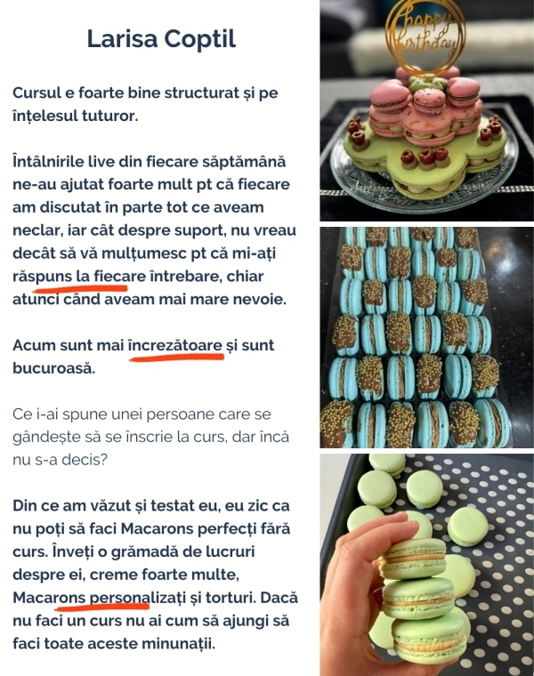 Fac macarons din 2014, iar în ultimii ani am lucrat direct cu sute de cursanți care își doreau același lucru: