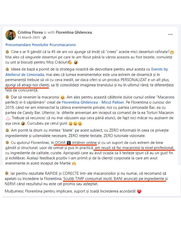 Dacă vrei să înveți mai repede, cu ghidare directă și feedback, nu prin ani de încercări, te aștept în programul Macarons Perfecți (Nivel 1).