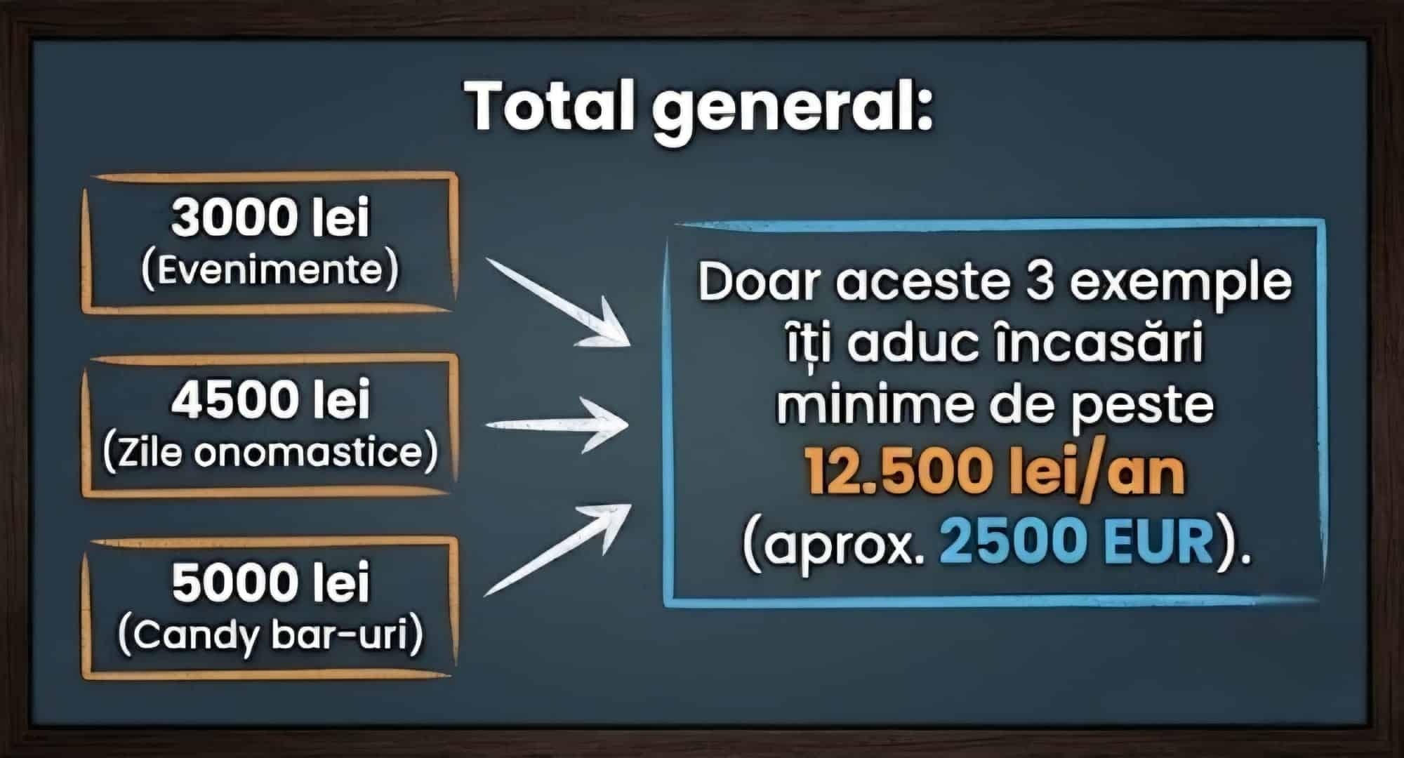 Am făcut o simulare simplă, bazată pe doar 3 tipuri de evenimente: nunți/botezuri, zile onomastice, candy bar-uri.